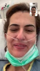 Estive 15 dias doente e 8 no hospital, num setor de isolamento, sem poder ver ninguém, sem receber visita, sem ver meu marido e minha filha. Tive muito medo, mas me mantive tranquila e confiante e a cada dia ia tendo uma pequena melhora. Tive os primeiros sintomas no dia 13/03/20, febre, dores fortes no corpo e tosse. Três dias depois já não conseguia comer e me sentia muito debilitada, sem forças para caminhar, falar e com respiração pesada. No dia 19/03 fui internada com princípio de pneumonia e foi confirmado que eu era Covid positivo.